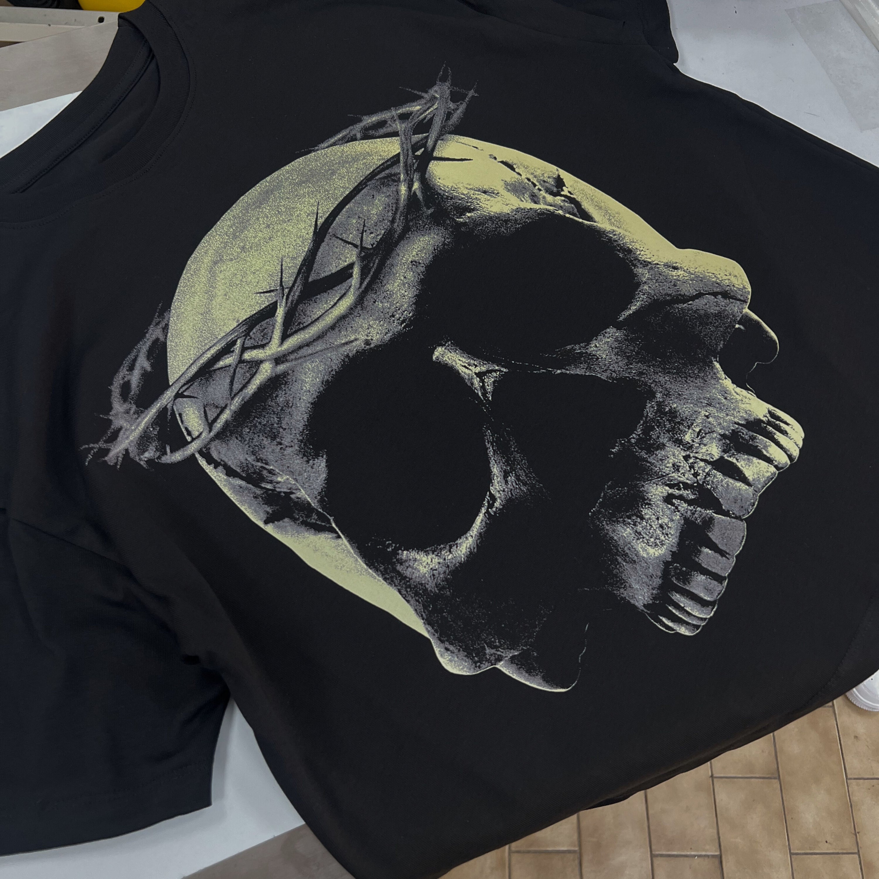 deposito d'inchiostro diretto sul capo: micro-dettagli leggibili e colori che respirano.