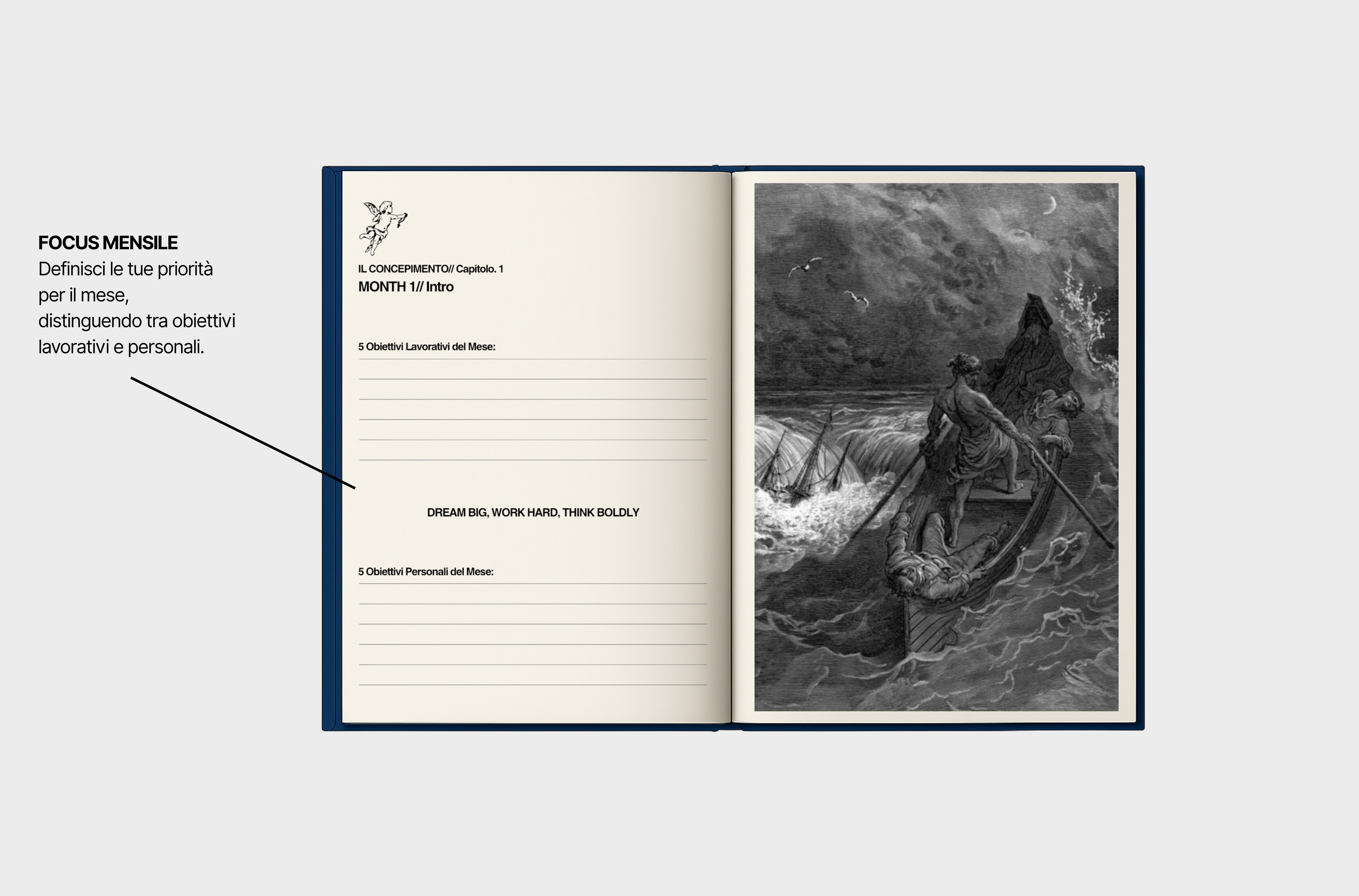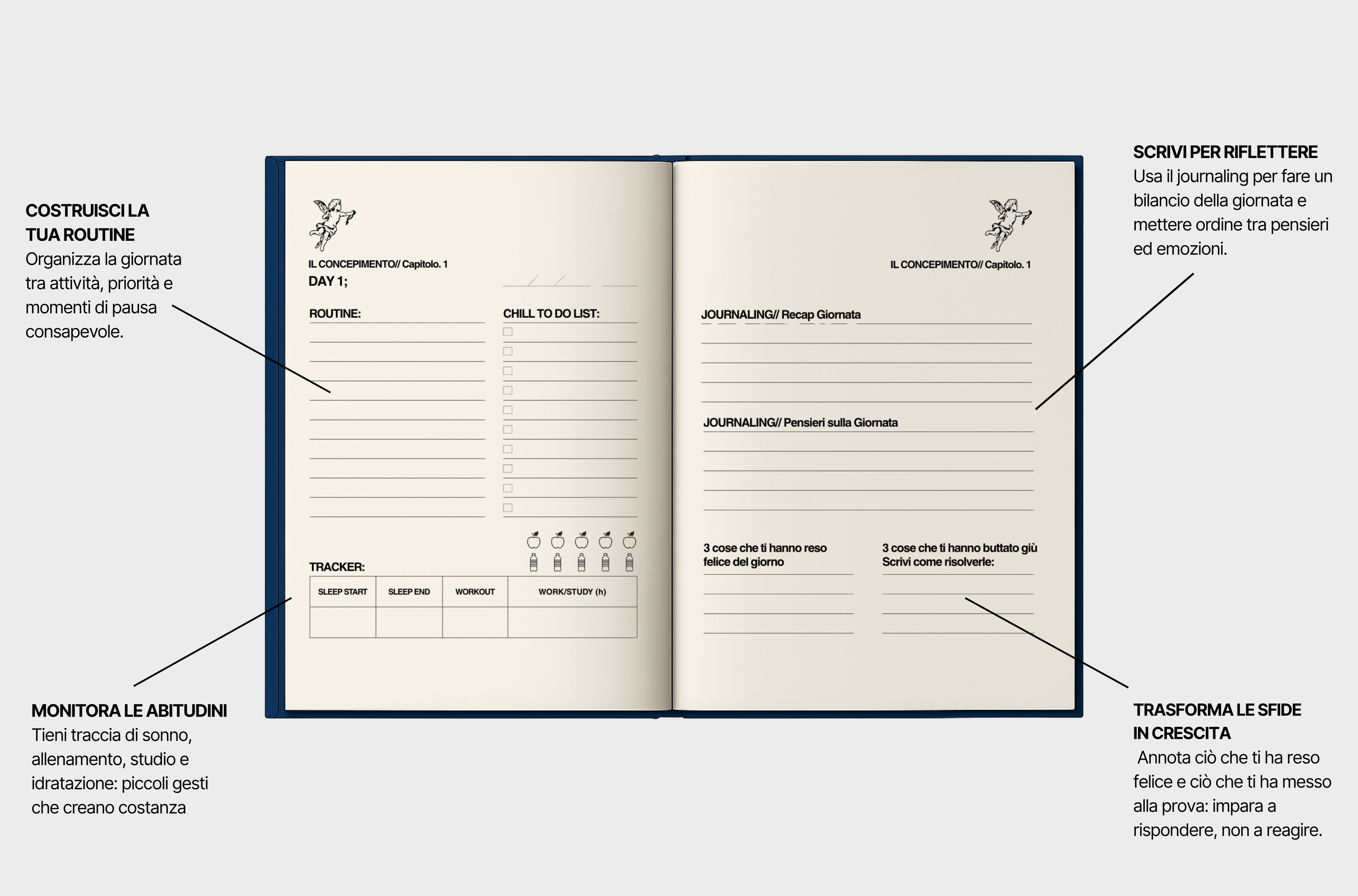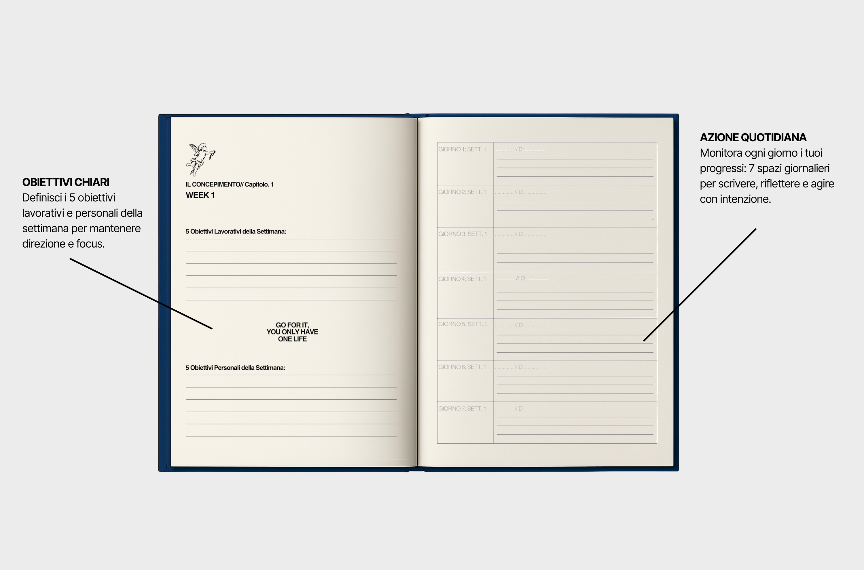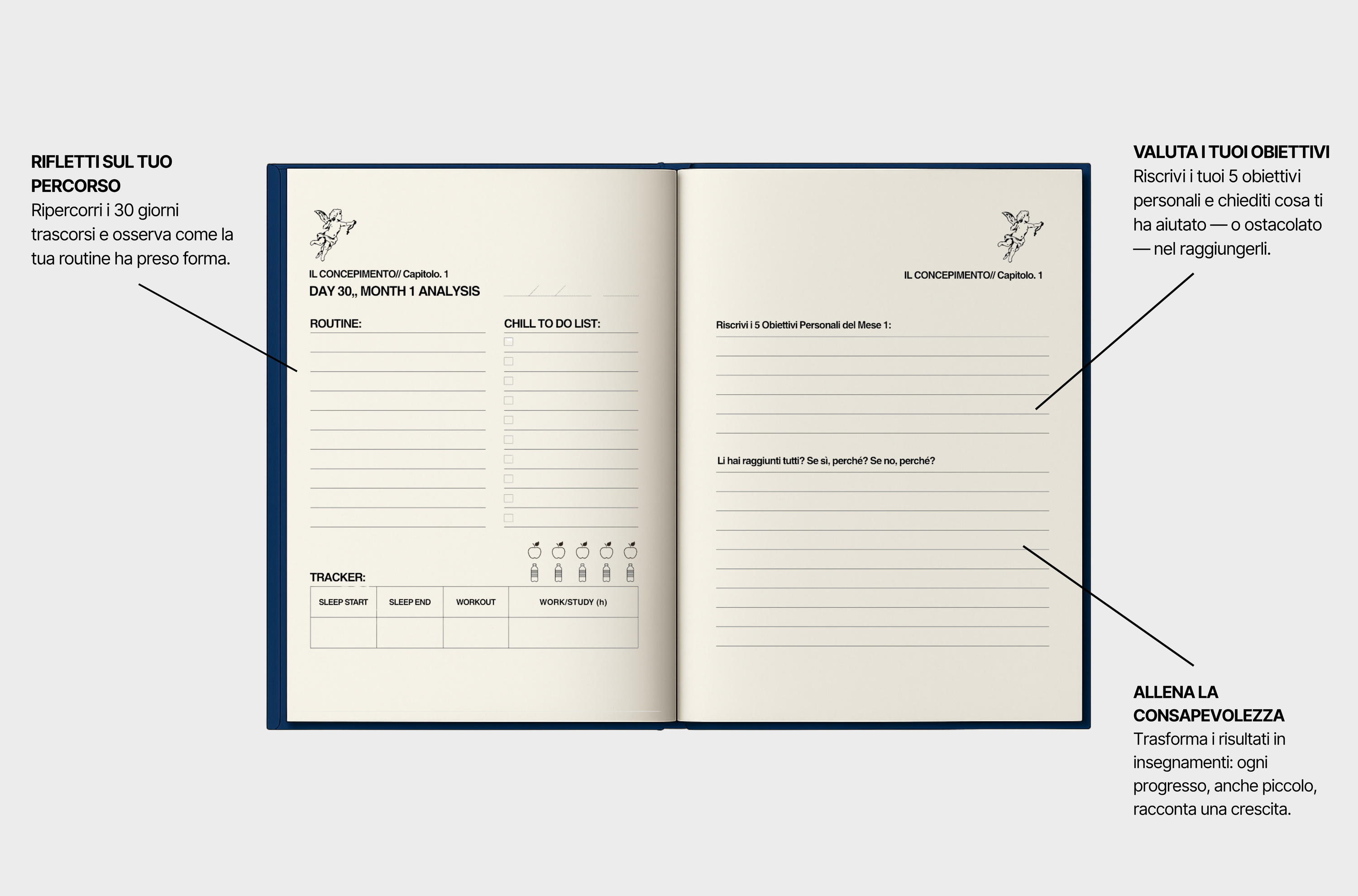 - Sezioni di journaling quotidiano e riflessione settimanale